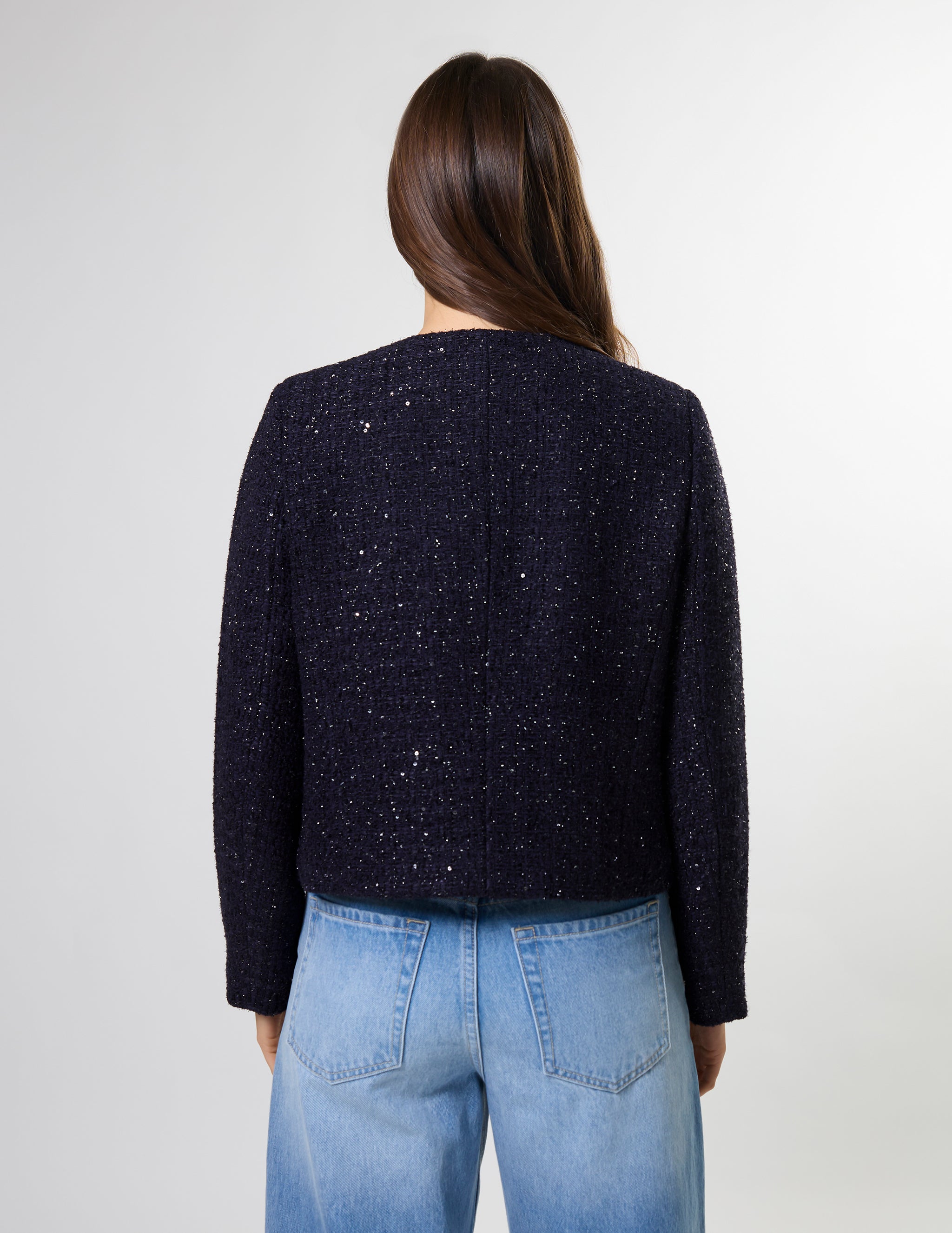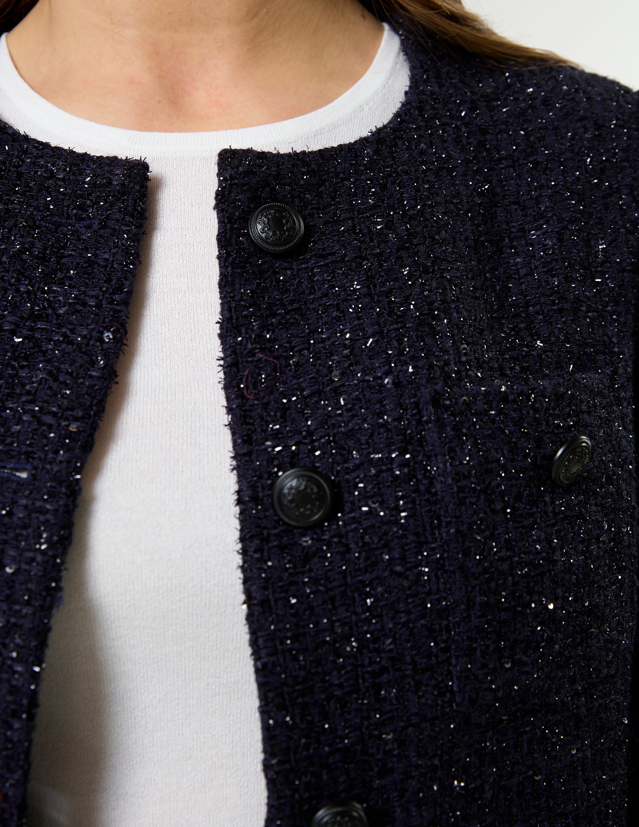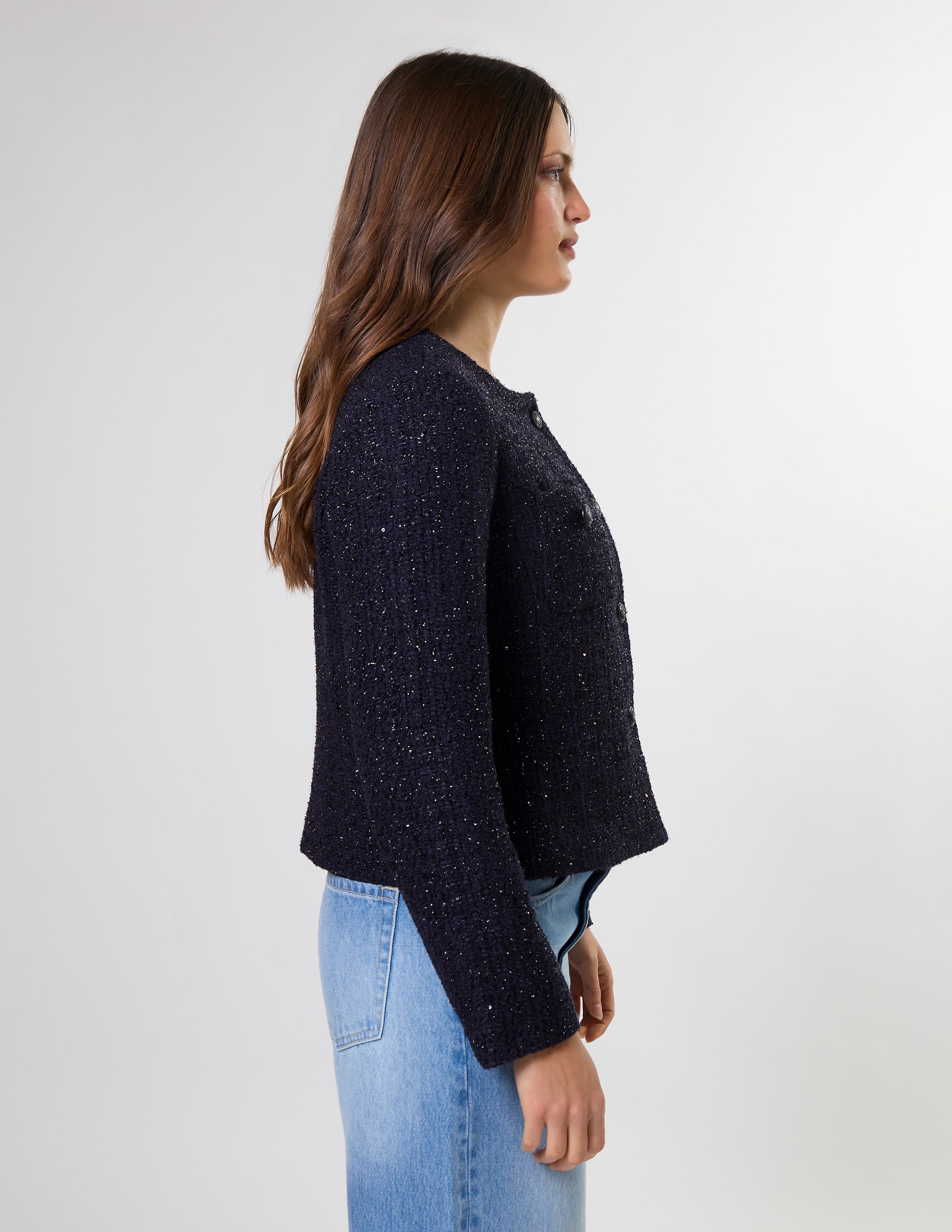 Tailored boxy jacket in boucle fabric and novelty buttons. Shoulder pads for shaping and fully lined.