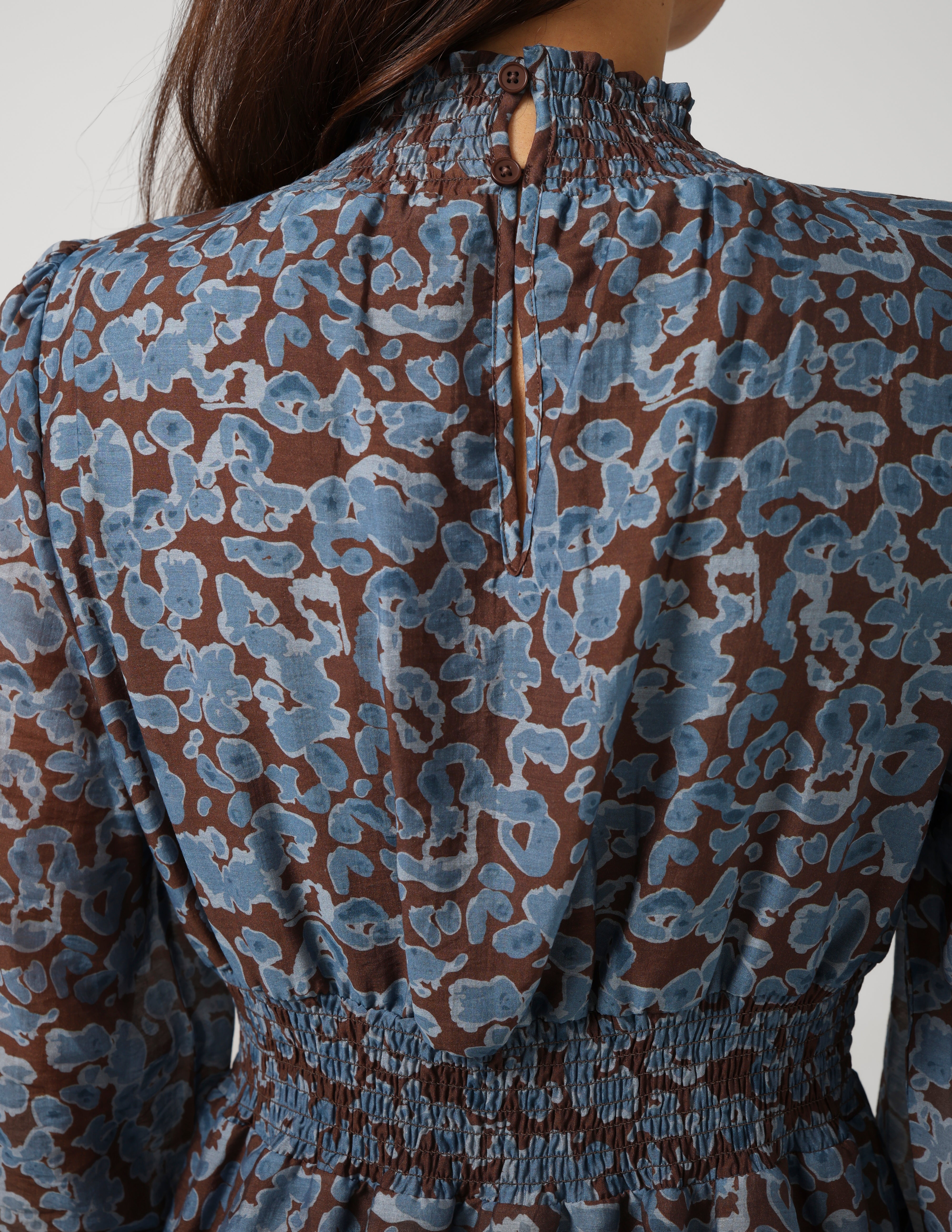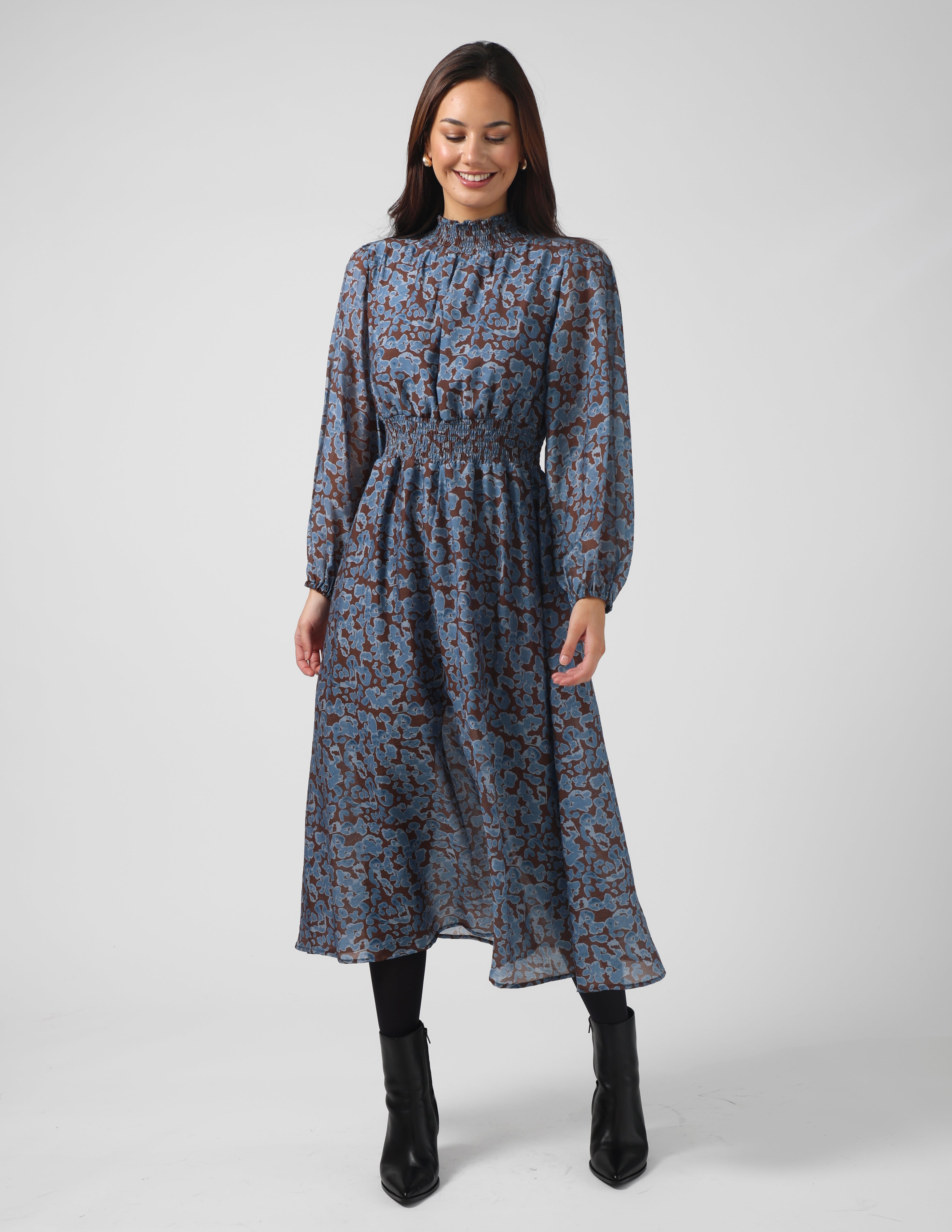 Lined midi dress with elasticated neckline, cuffs and shirring detail through centre waist.