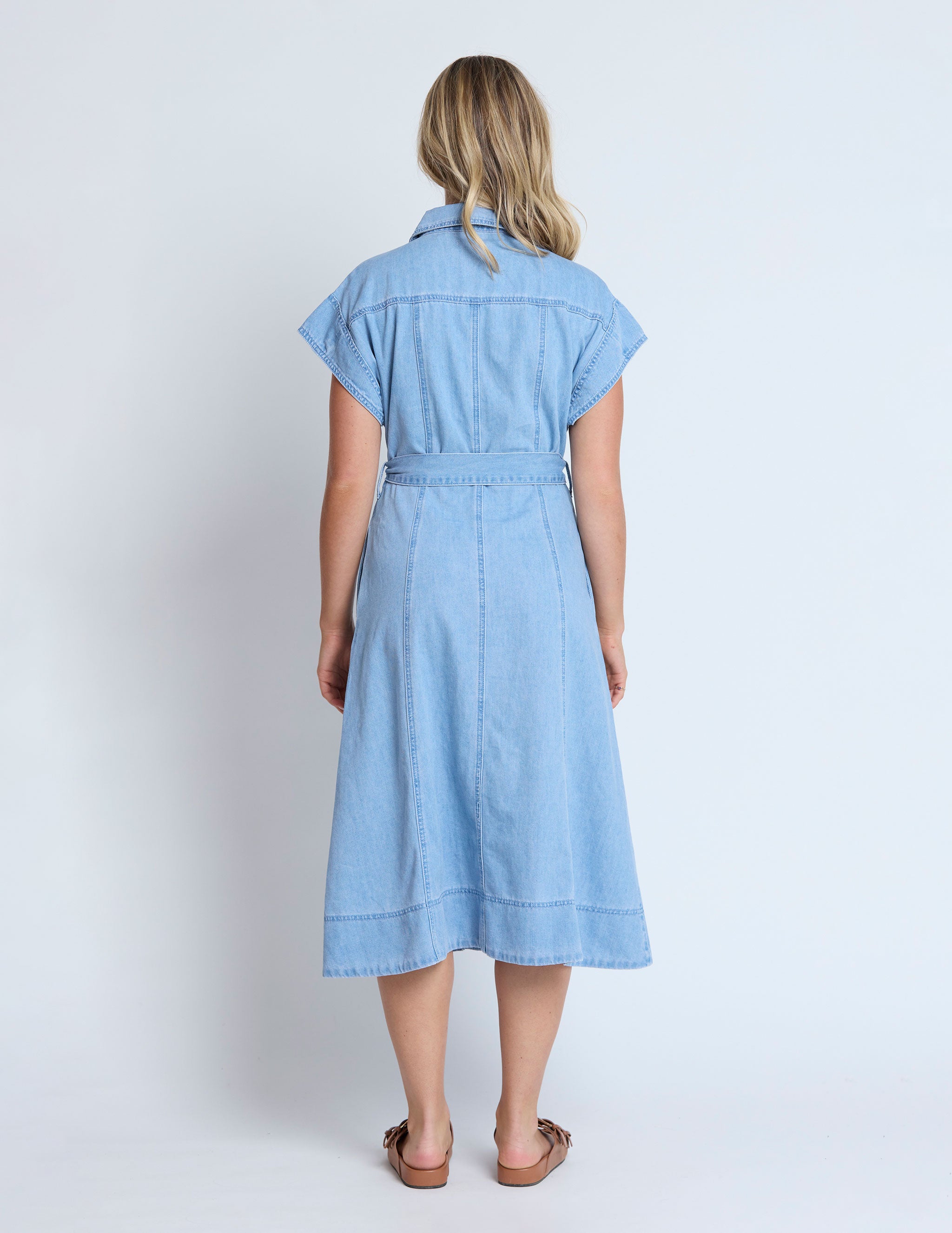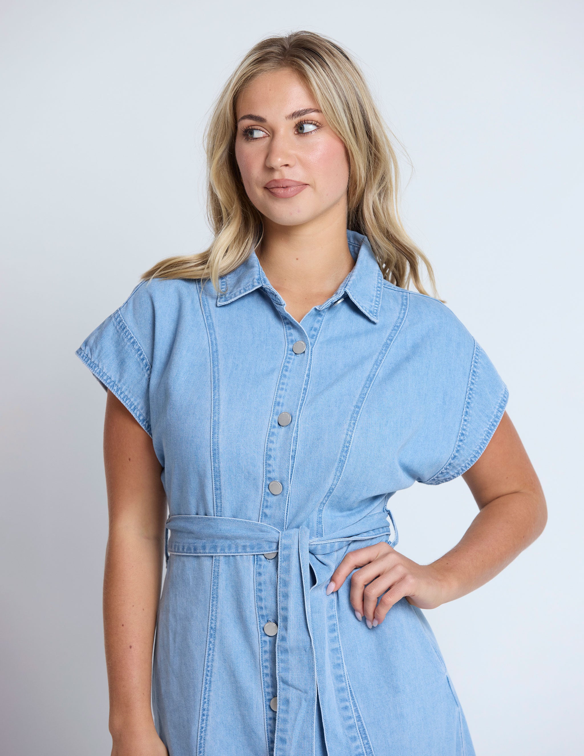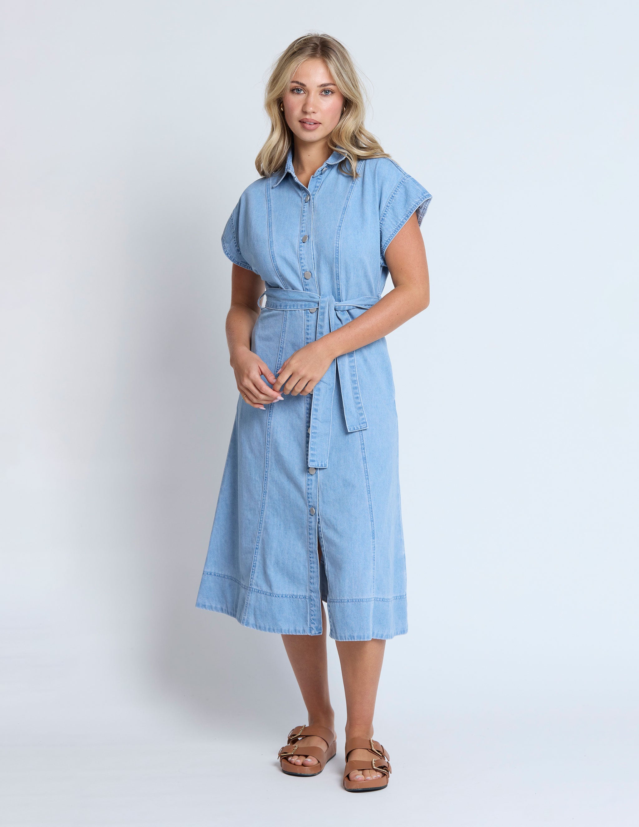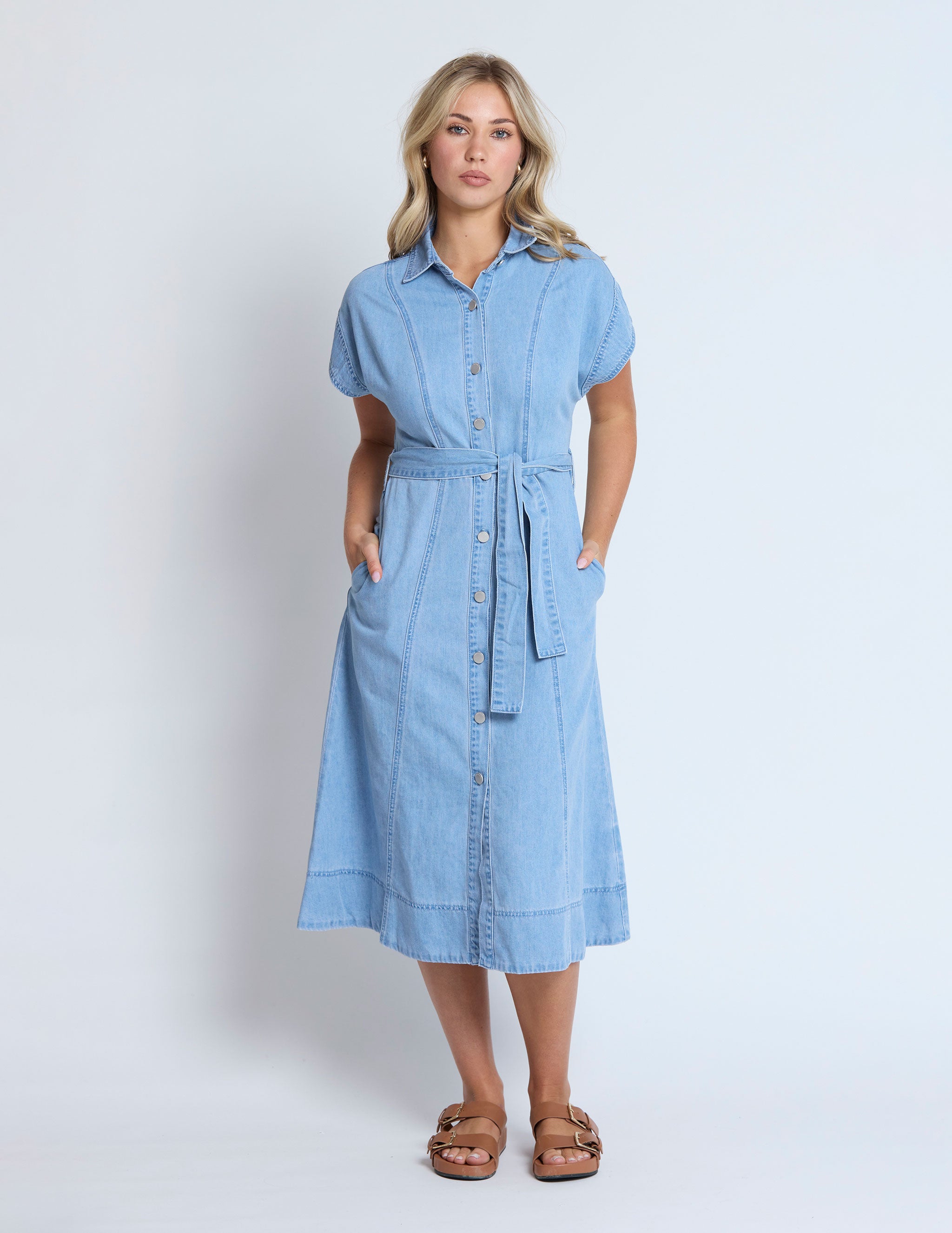 Denim drop shoulder button front midi dress with collar and side pockets . Logo tack buttons, panel seams and slightly A line shaping through skirt. Self fabric tie belt