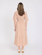 V neck tiered maxi dress with fitted upper bodice , puffed sleeves and elasticated waist