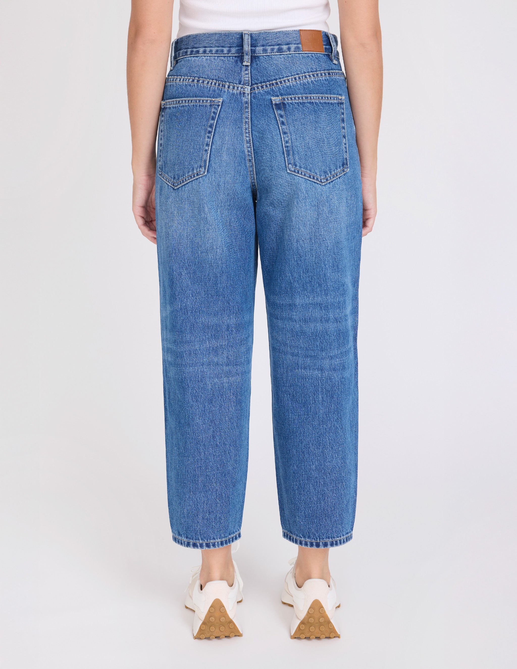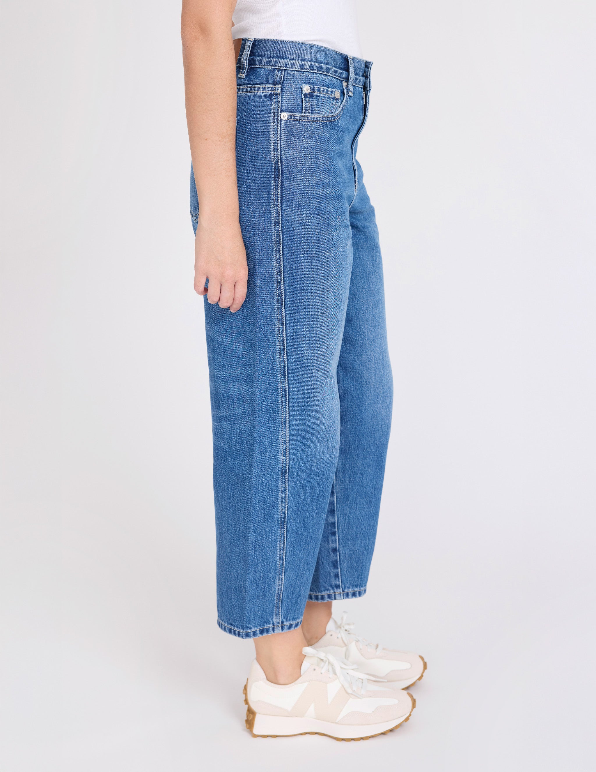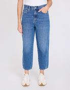 Mid rise ankle length barrel shaped jean with classic pocket styling
