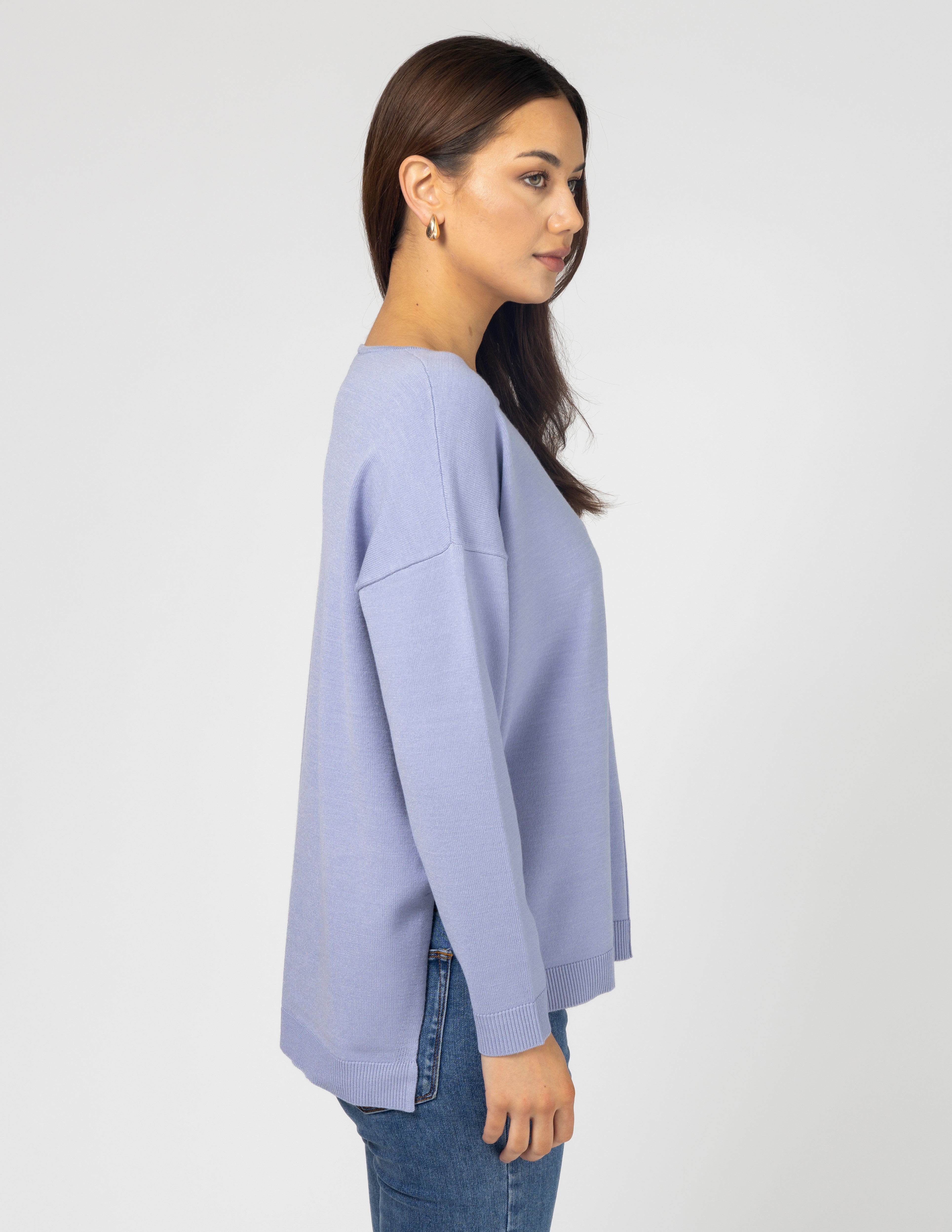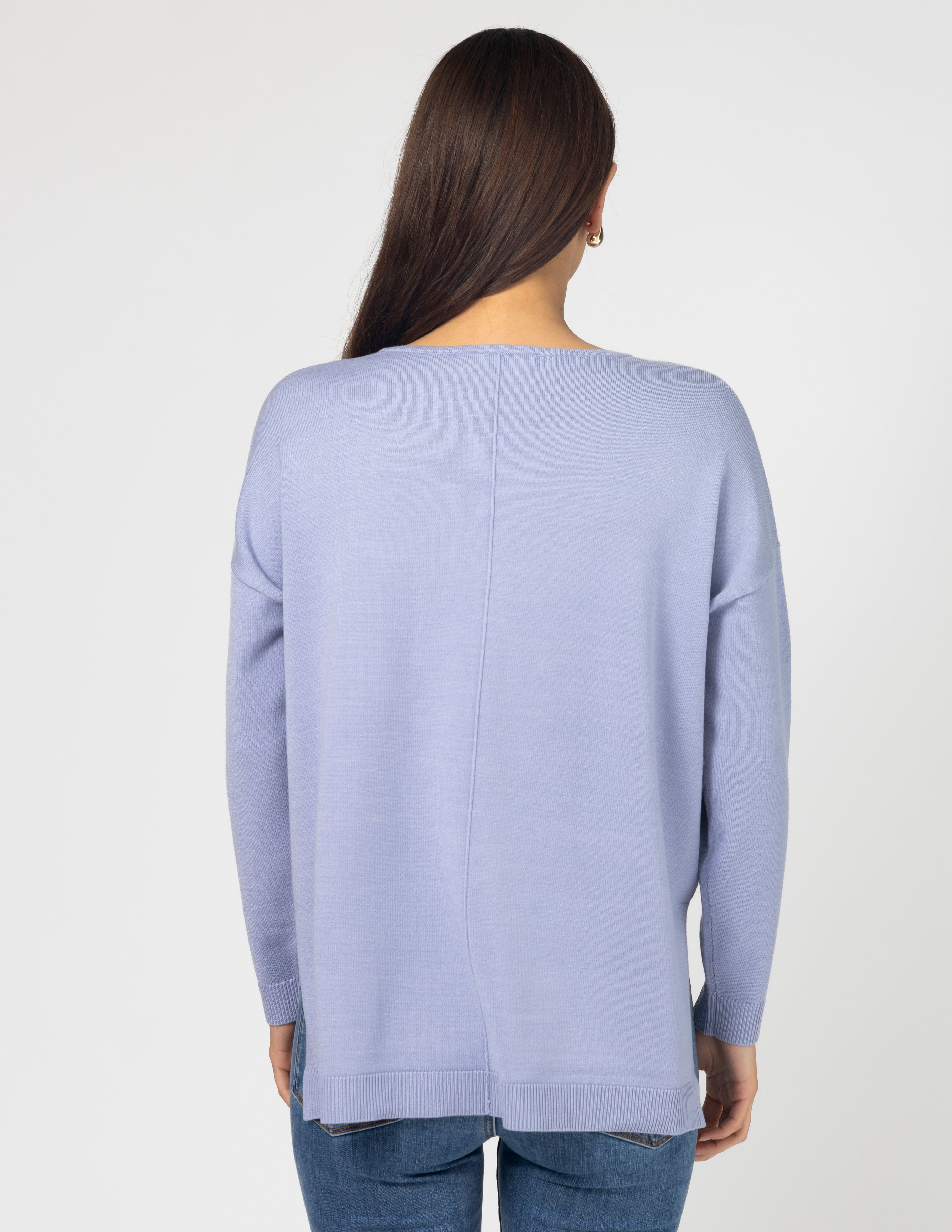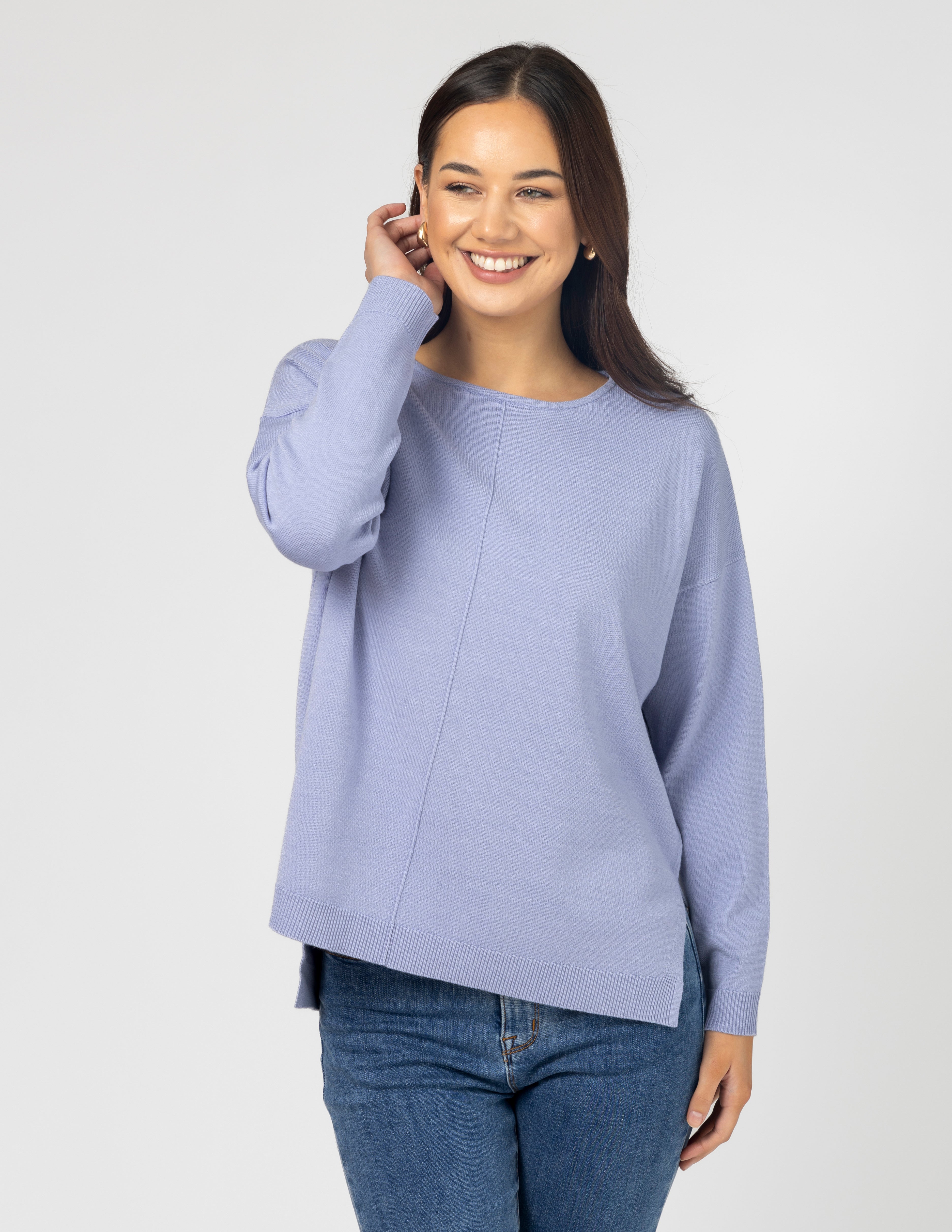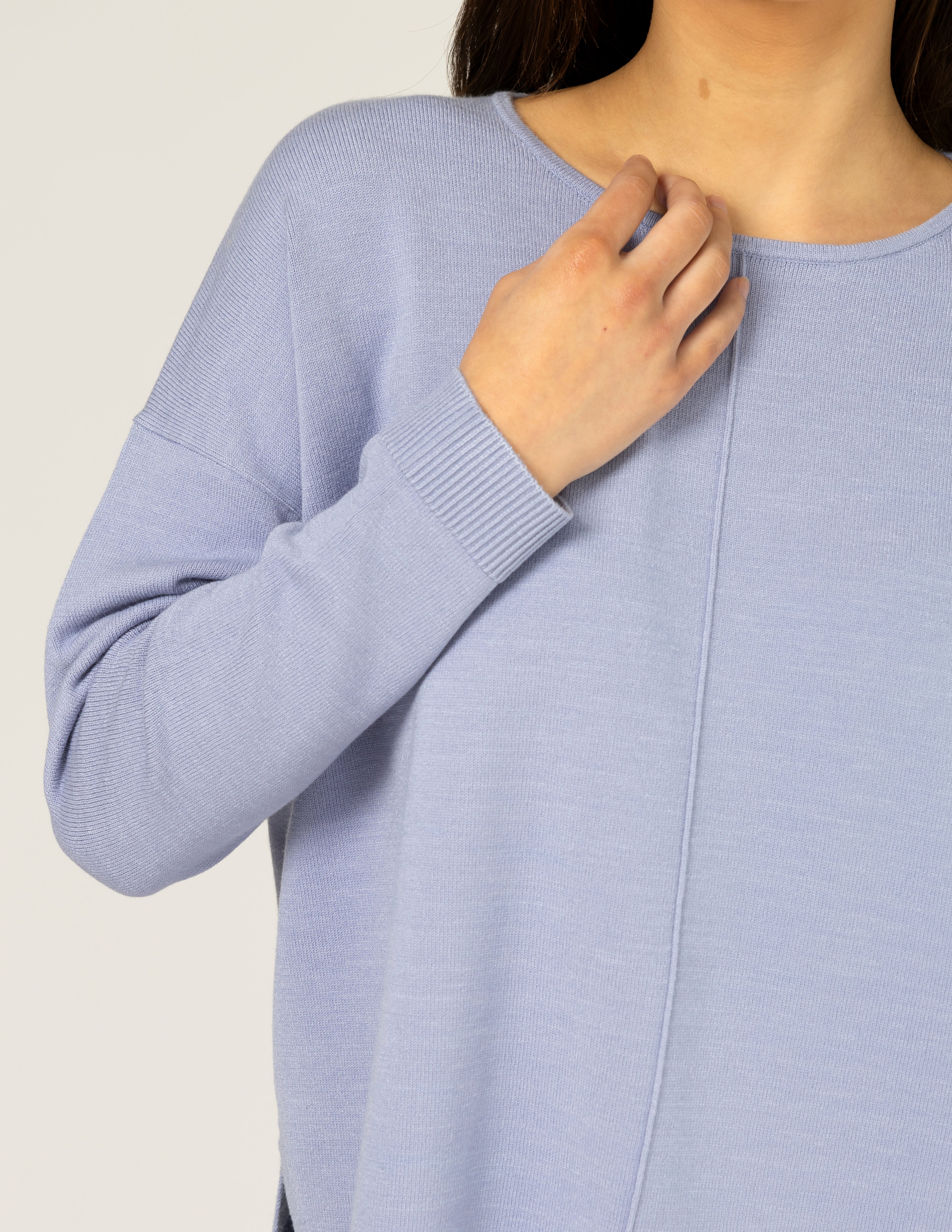 Relaxed fit knit with rolled neckline edge, rib trim on cuffs and hemline and jersey knit body. Exposed seam detail on centre front and back
