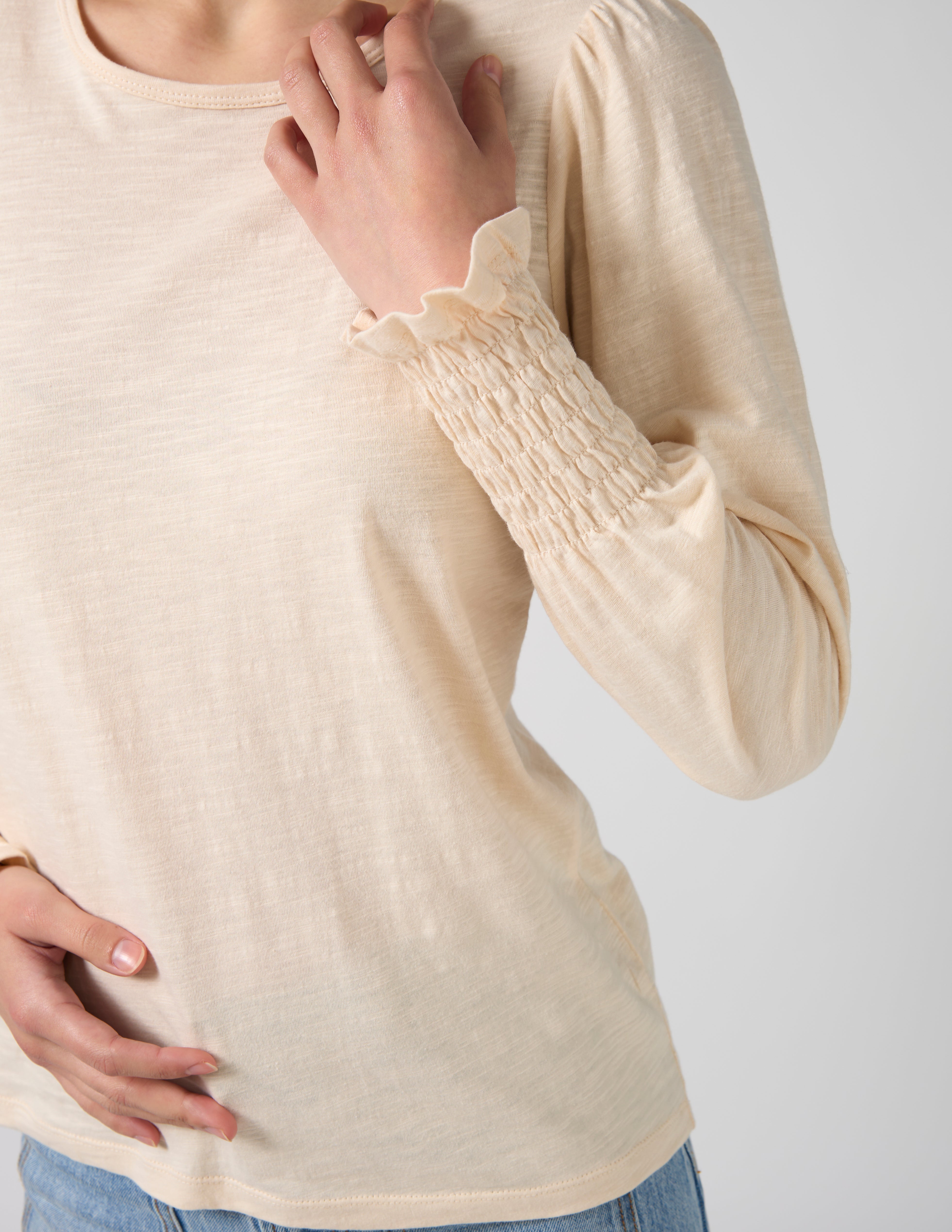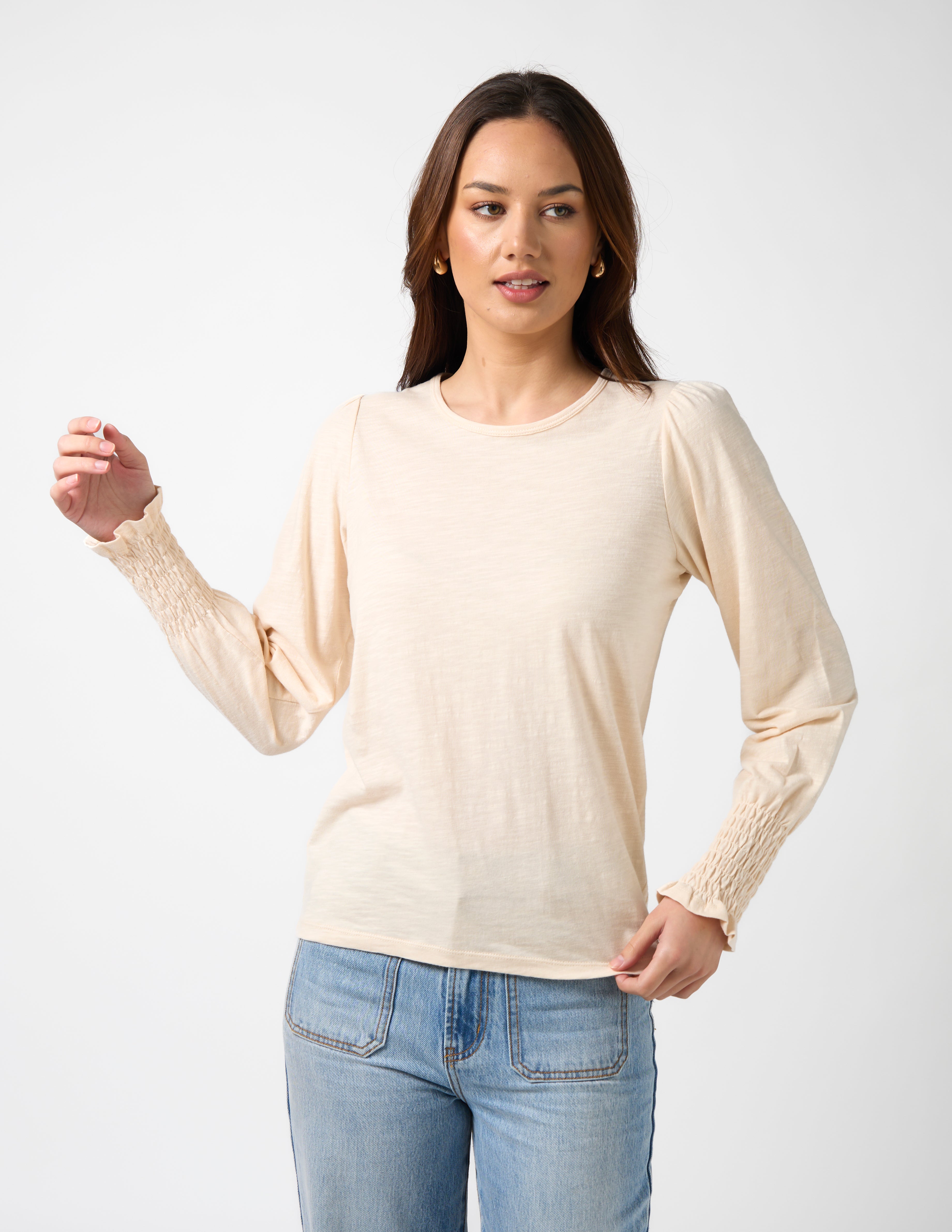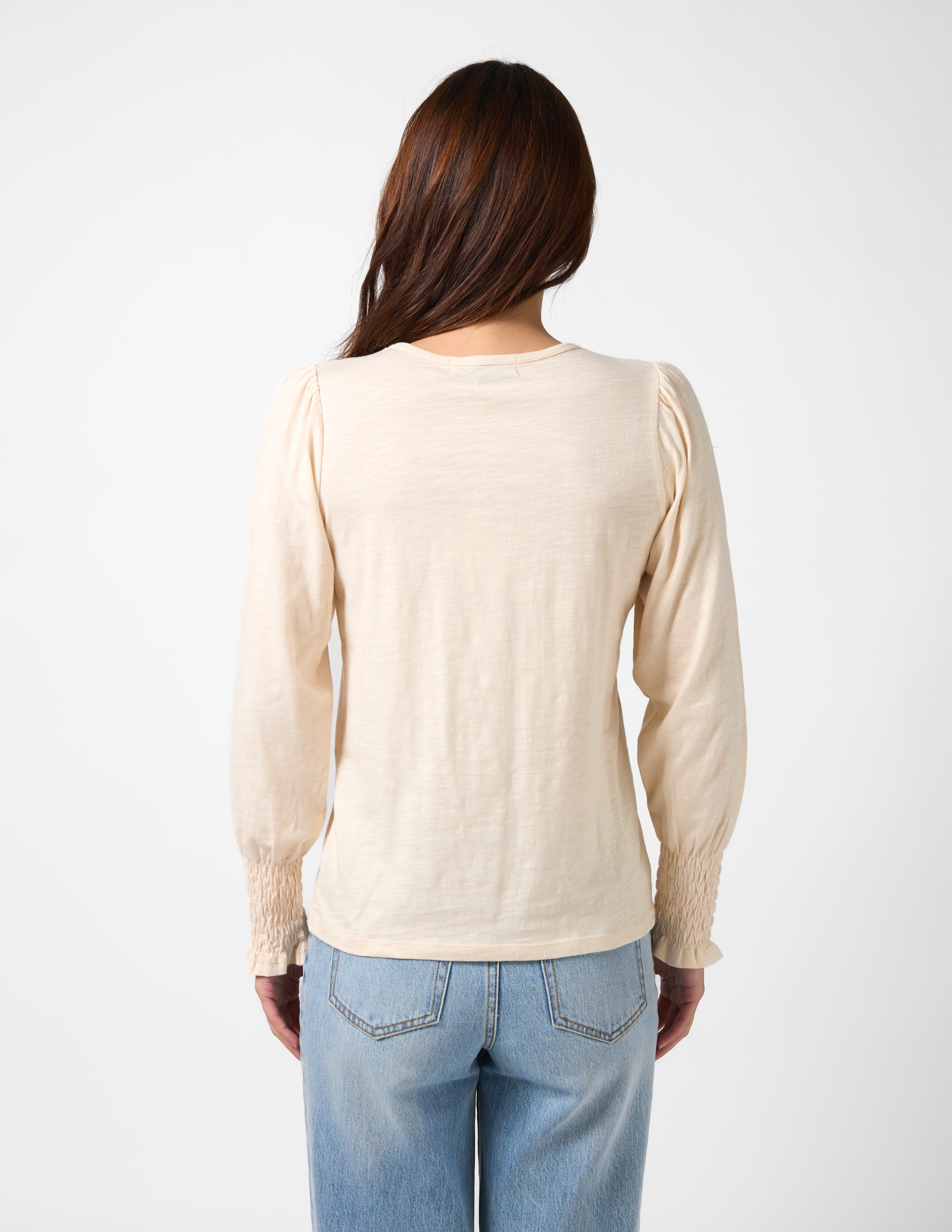 Crew neck long sleeve top with gathered sleeve head and shirring elasticated frill cuff.
