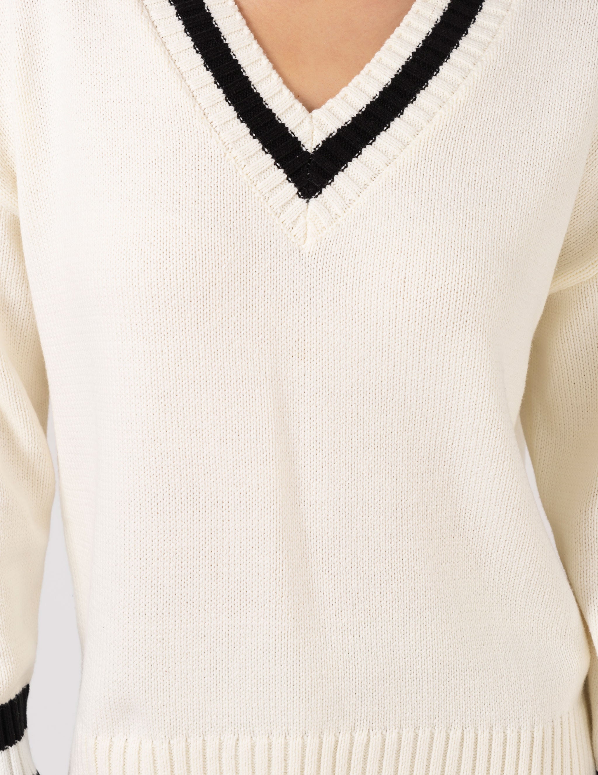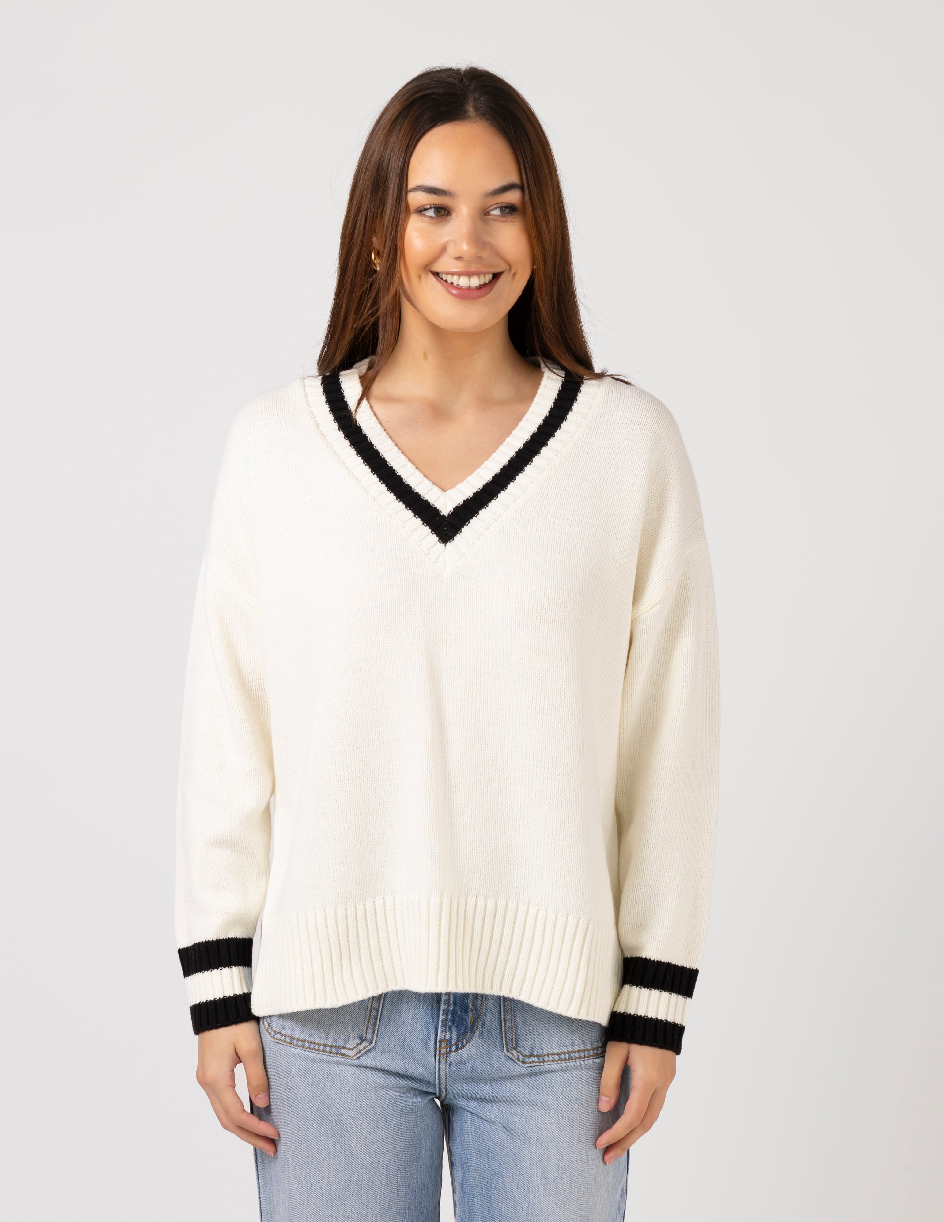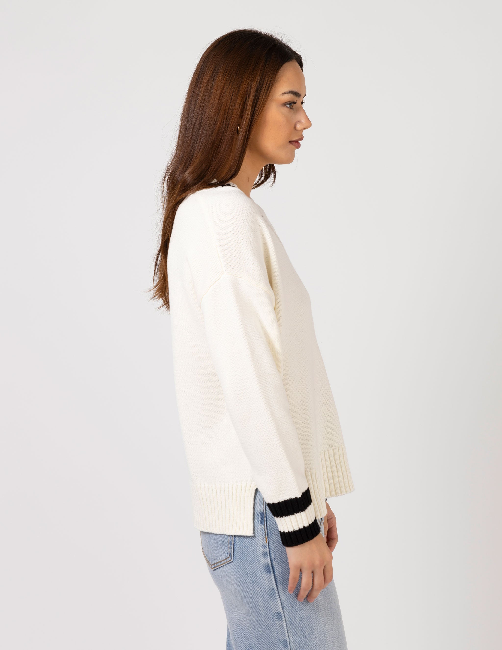V neck knit with contrast stripe though neckline, rib cuffs and hem and side split detail.