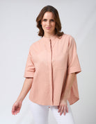 Relaxed fit blouse with mandarin collar , concealed front placket and elbow length cuffed sleeve. Back yoke seam with pleat detail and front chest pocket