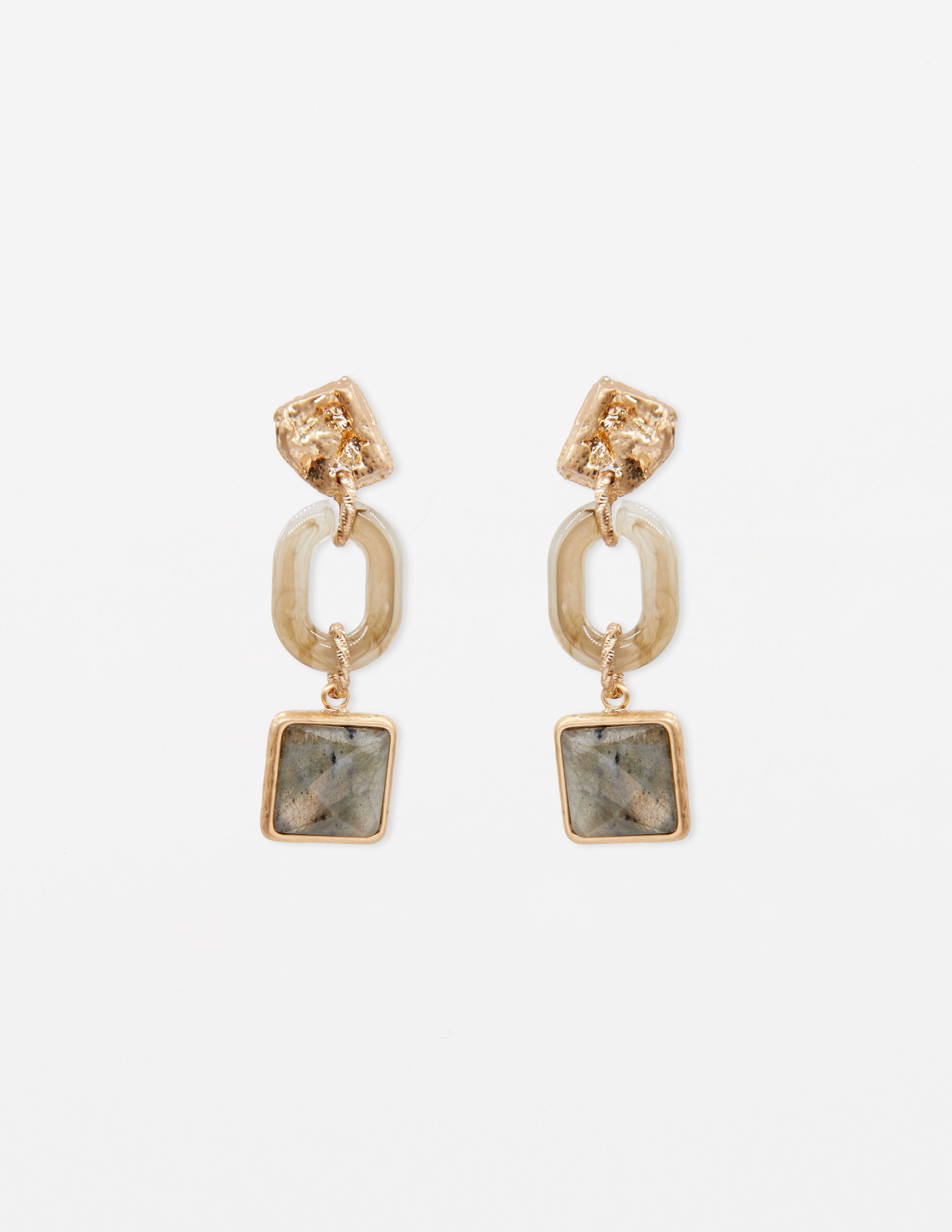 Earrings - Beaten Gold Resin Link With Grey Quartz