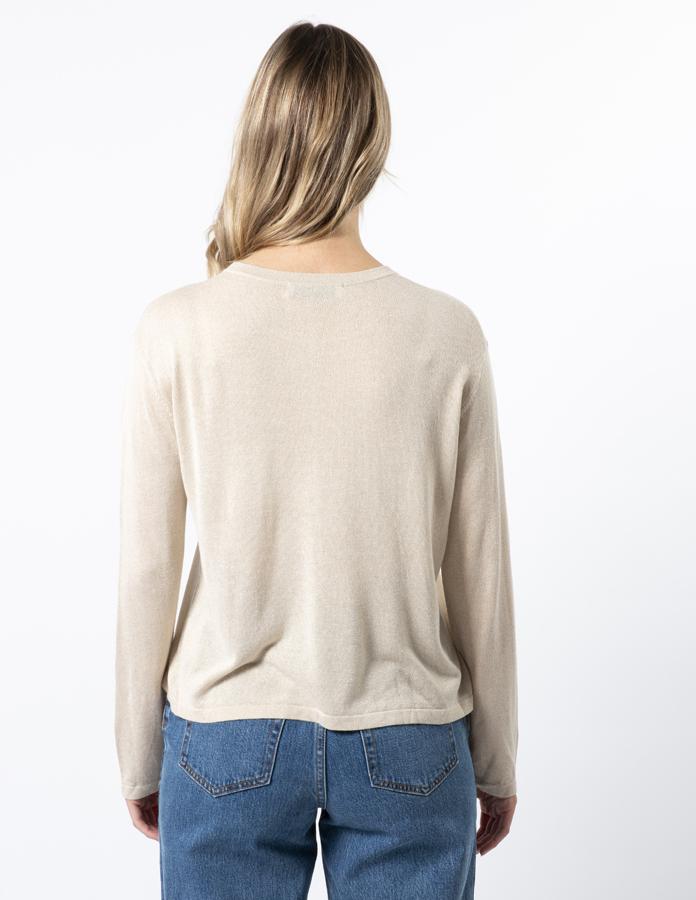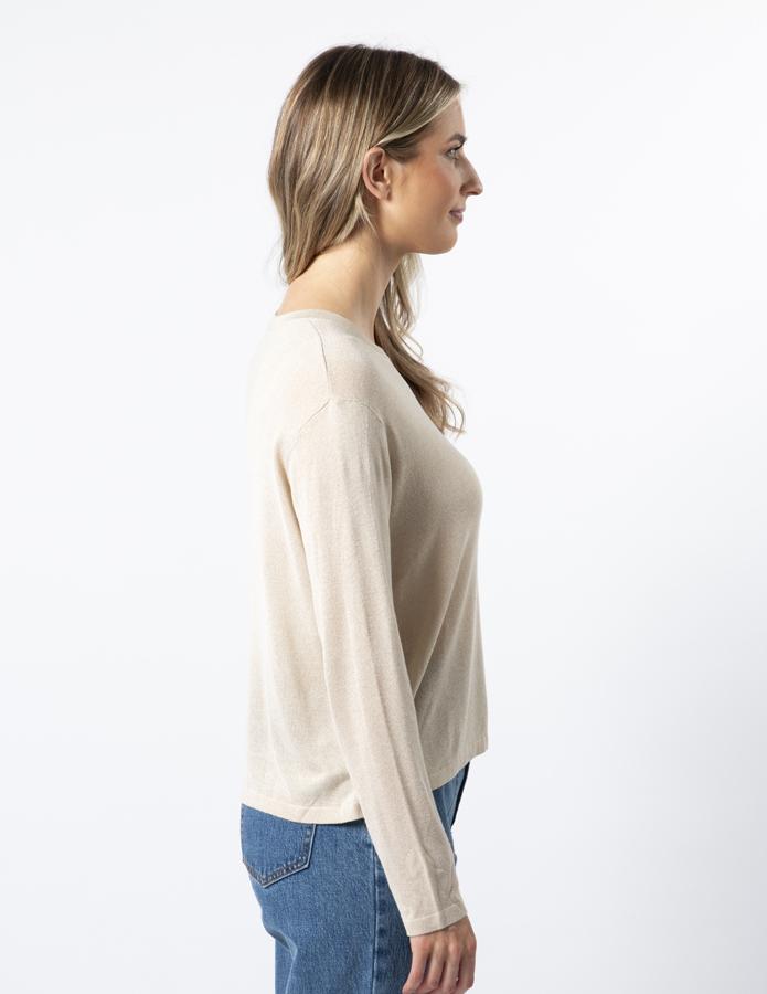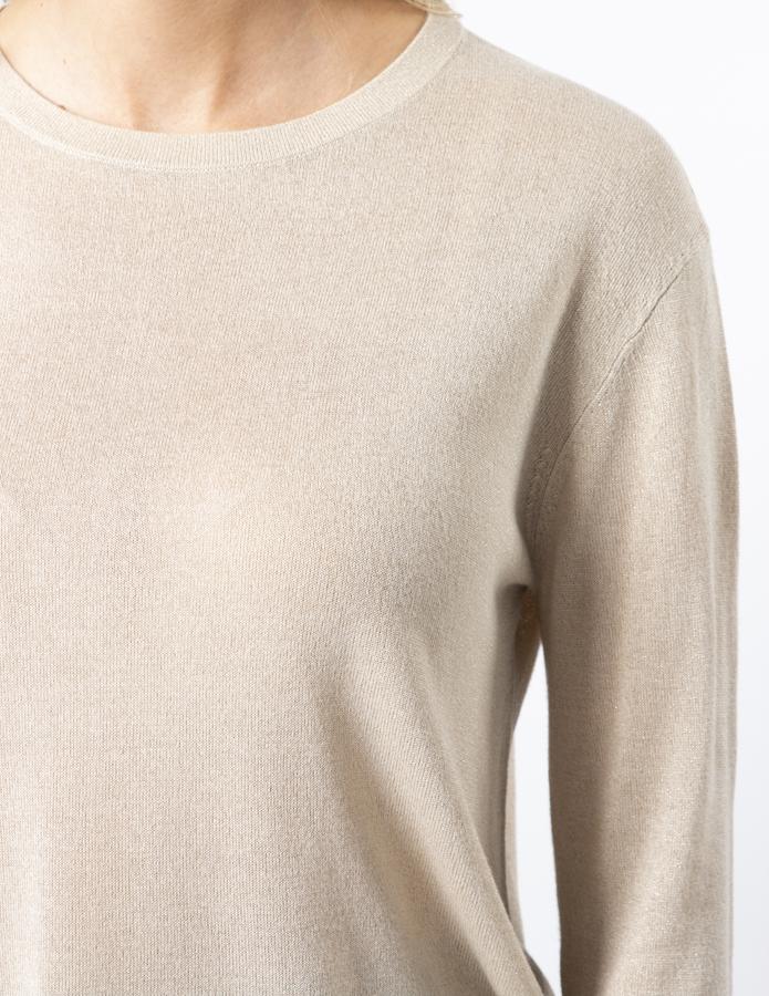 Crew neck jersey knit shimmer top with dropped slight dropped shoulder