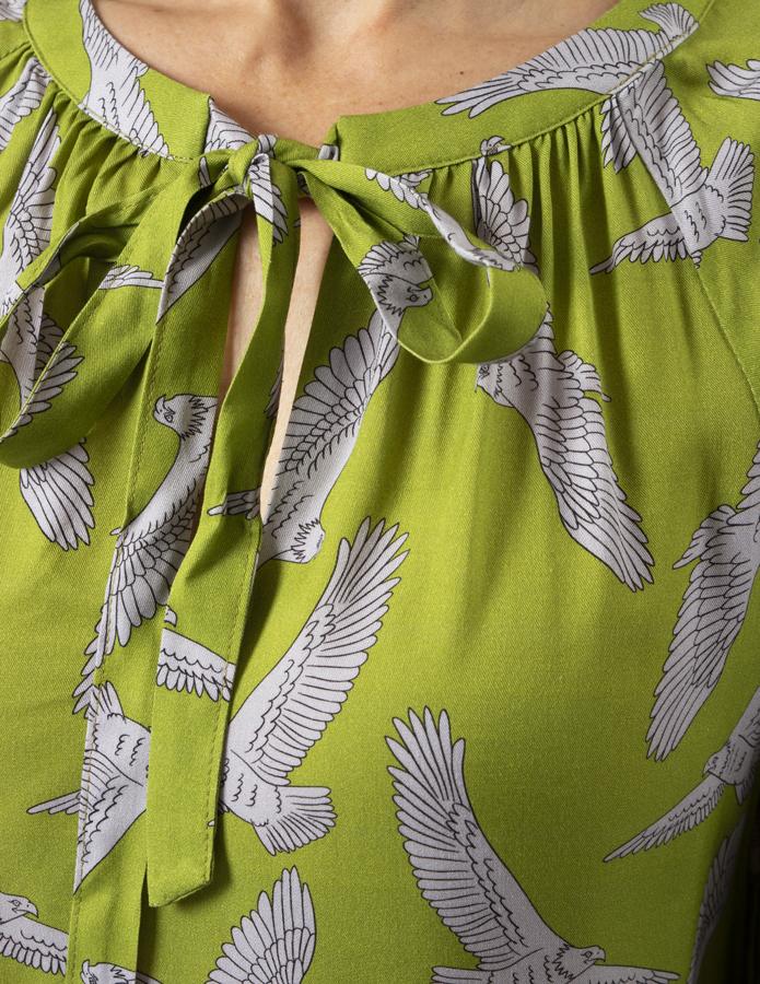 Raglan blouse with gathering around neck bind and self fabric ties