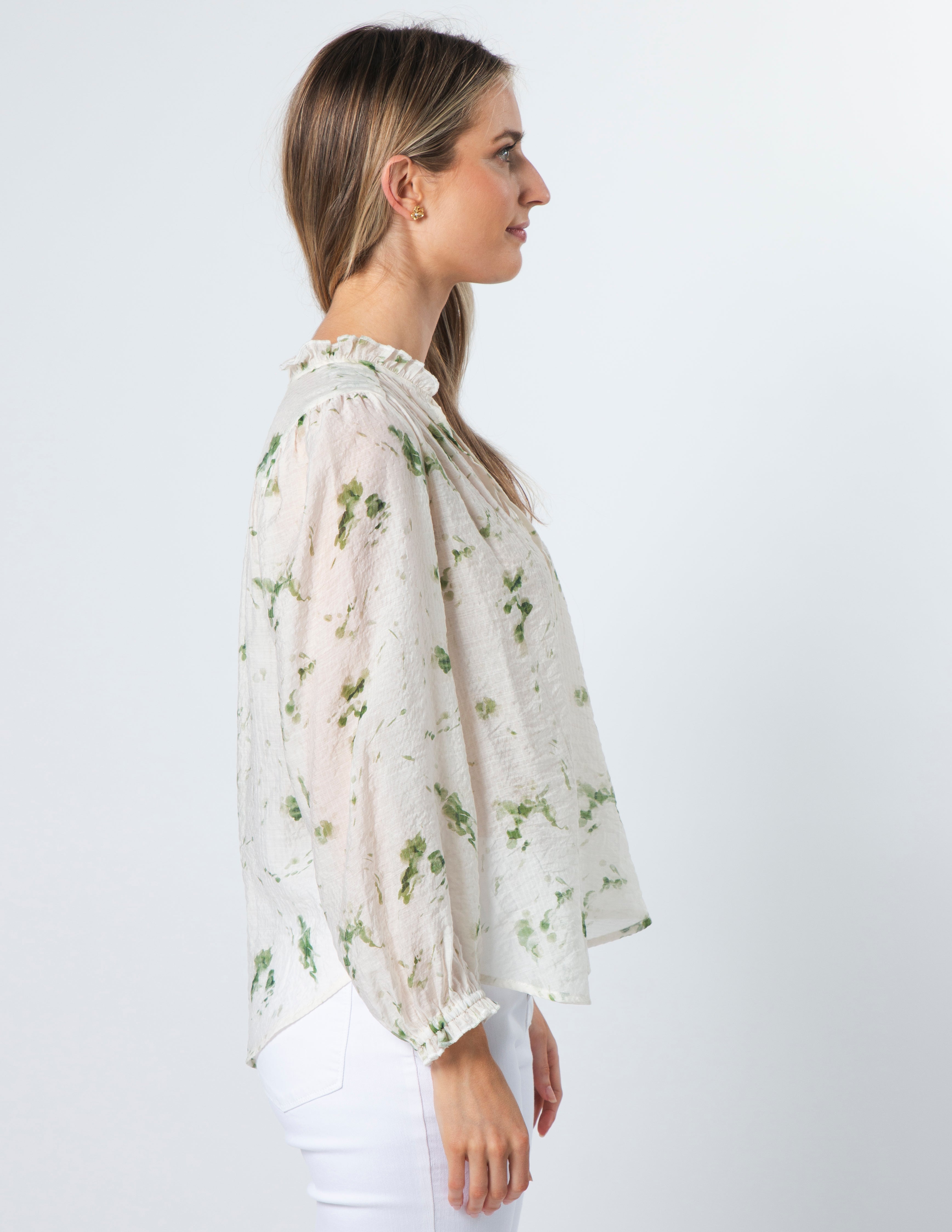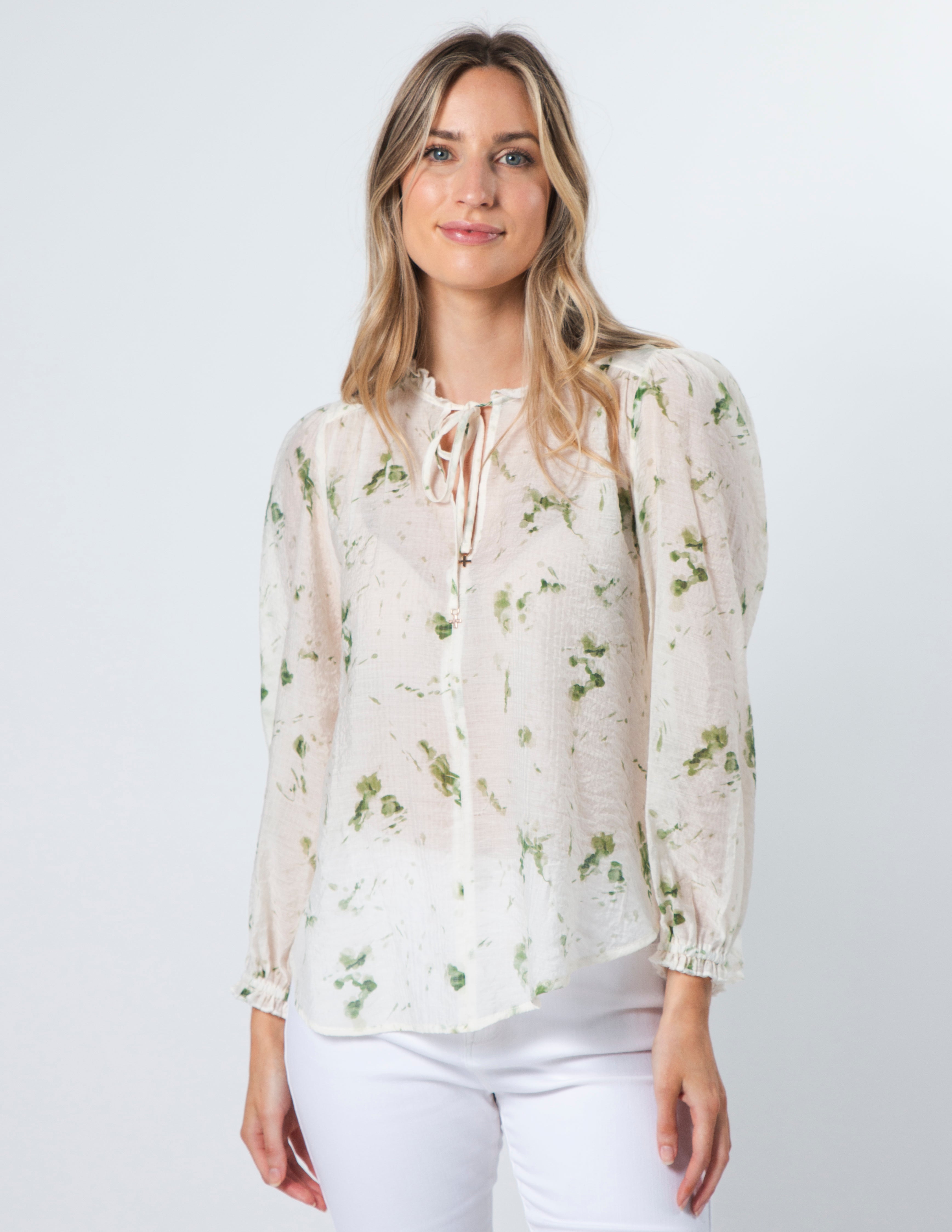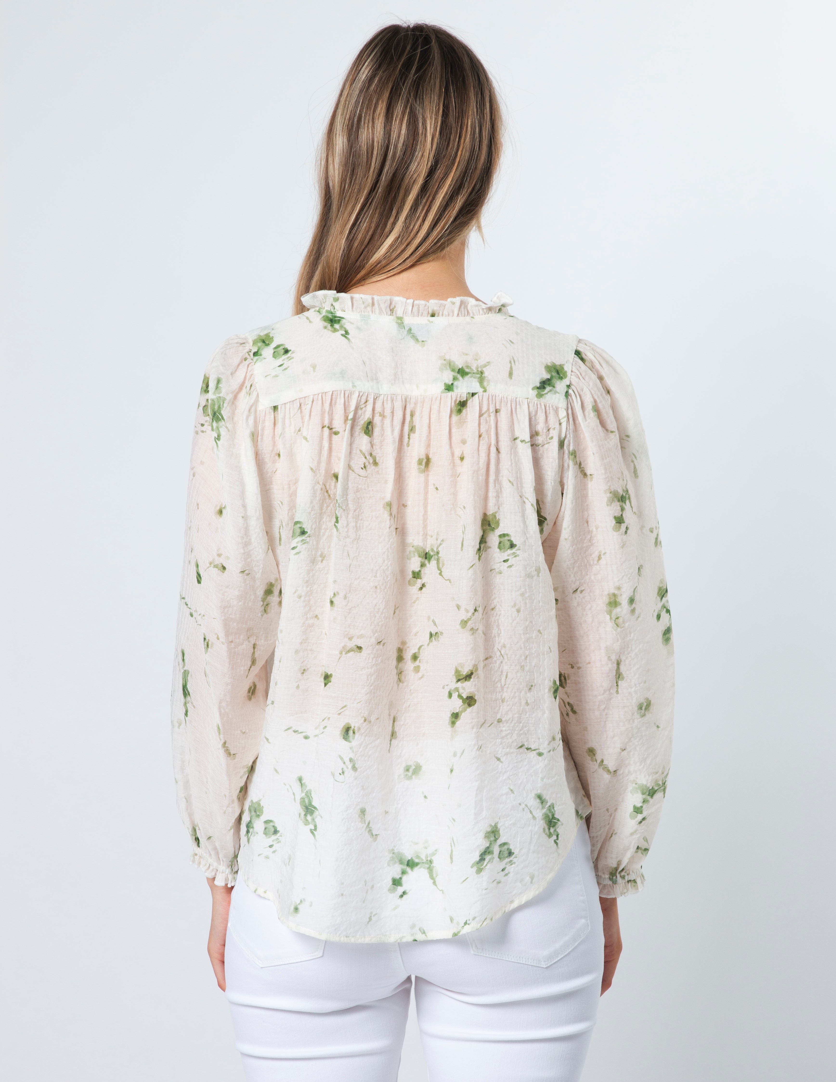 Sheer floral blouse with gathered yoke seams and shoulders. V neckline with self fabric ties and elasticated frill cuff